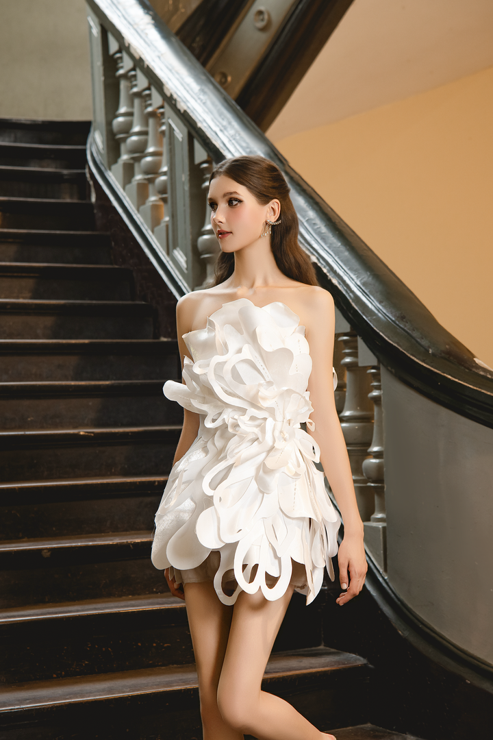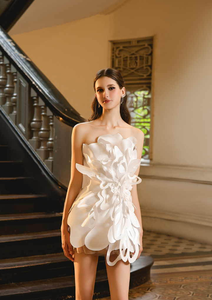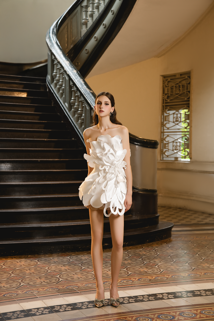 Thiết kế cúp ngực dáng ngắn, phần thân váy nổi bật với chi tiết hoa 3D được xử lý cắt laser tinh xảo, tạo cảm giác chuyển động tự nhiên như những cánh hoa đang bung nở.