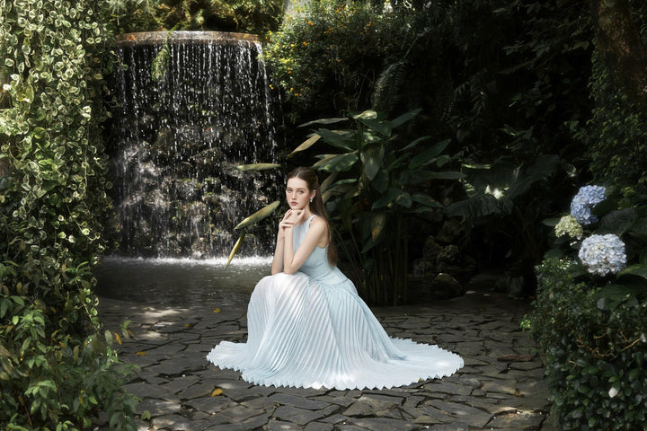Lớp voan xếp pli mềm mại ôm theo từng nhịp bước, gợi nhớ đến sự dịu dàng và tinh khôi của những thiếu nữ giữa khu vườn ngập tràn ánh nắng.