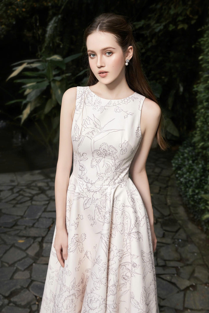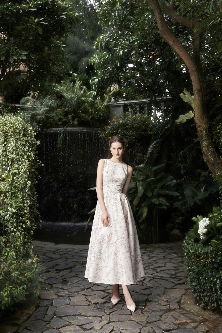 Phần cổ tròn kín đáo kết hợp dáng xoè mềm mại, giúp tôn lên vẻ đẹp thanh lịch và quý phái. Đây là lựa chọn hoàn hảo cho những buổi tiệc vườn hay những cuộc dạo chơi đầy thi vị.