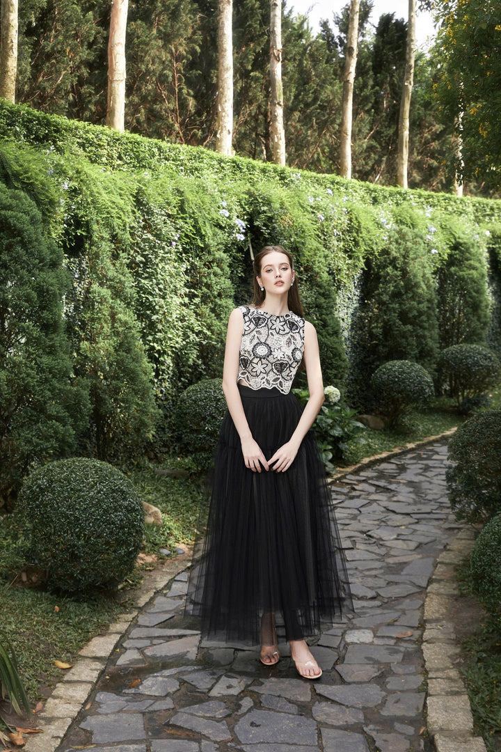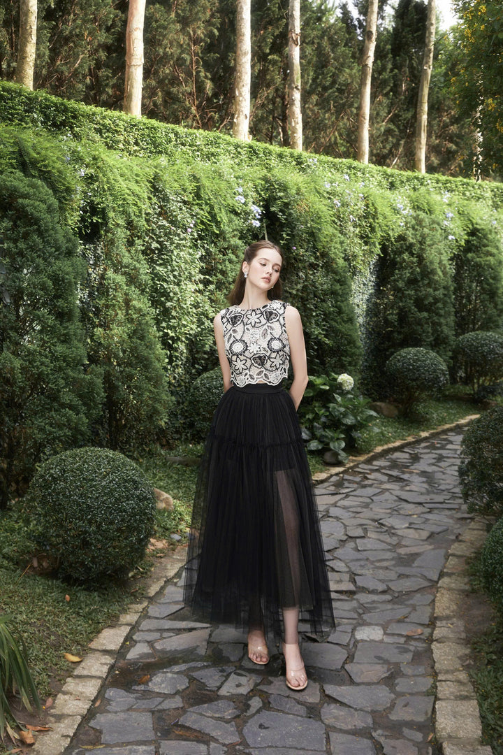 MARINDA SET - Set Áo Ren Hoa Tinh Xảo và Chân Váy Voan Đen Xòe Sang Trọng