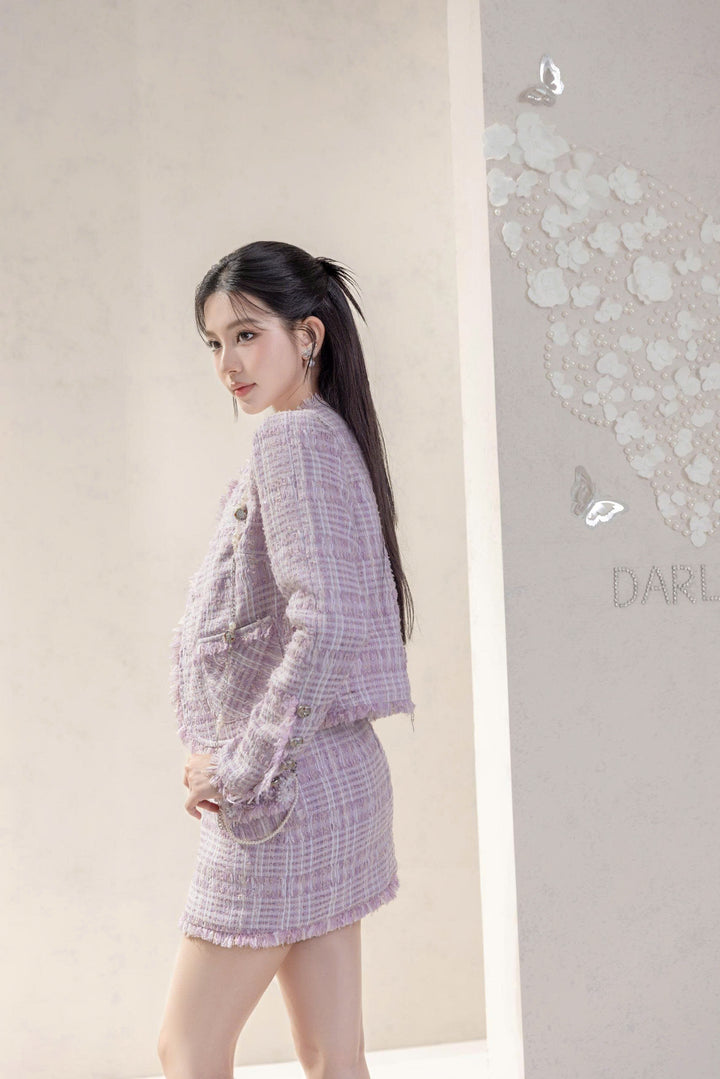 Bộ tweed tím mang phong thái tiểu thư hiện đại với chi tiết cúc ánh kim tinh xảo cùng phom dáng ôm vừa vặn, giúp tôn lên nét thanh lịch và ngọt ngào.