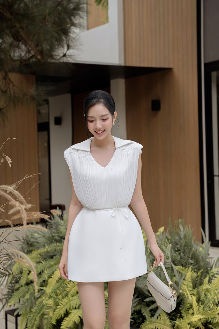 Điểm nhấn nằm ở chi tiết xếp ly mềm mại trên thân váy cùng chi tiết đính kết ren hoa tinh xảo tại eo, tạo nên vẻ đẹp thanh lịch, nhẹ nhàng mà vẫn tôn dáng.