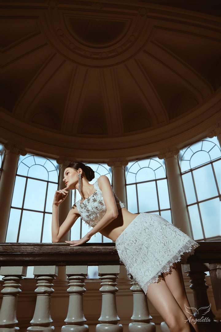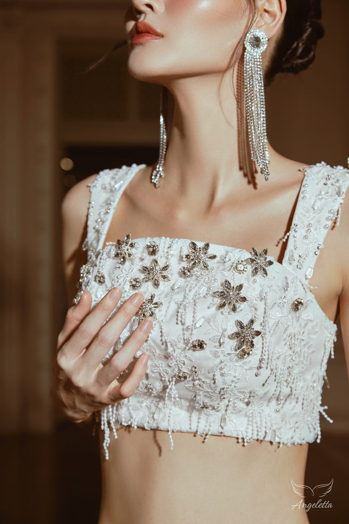 Áo croptop dây bảng to đính đá & Chân váy họa tiết ren hoa Blink Set