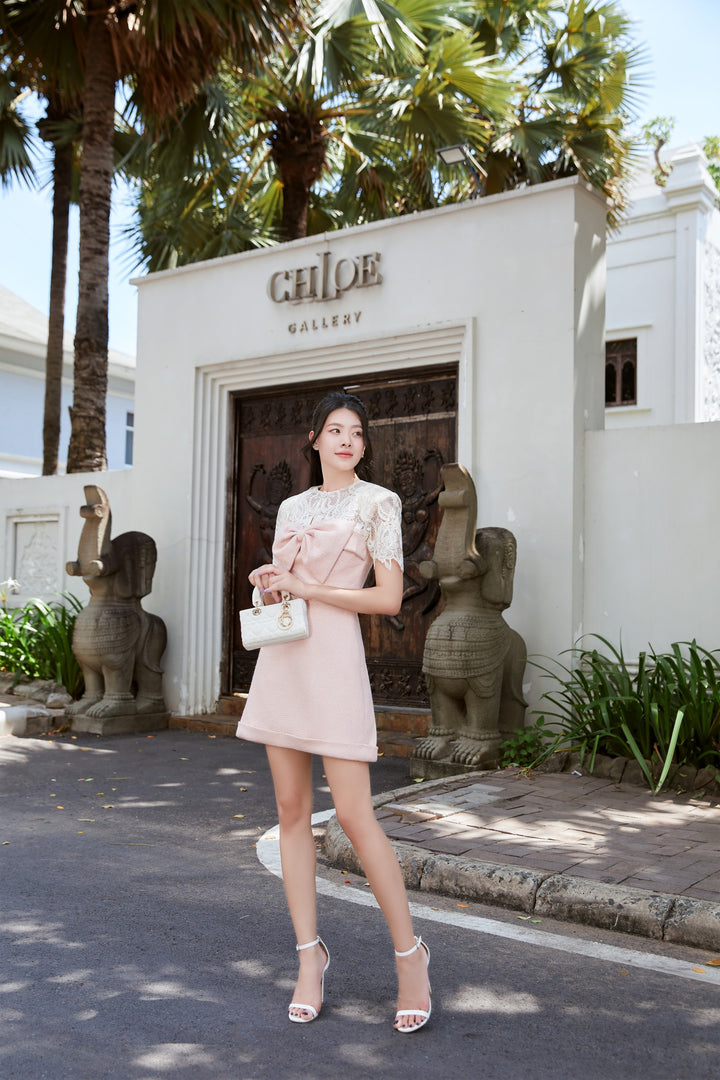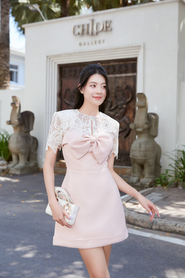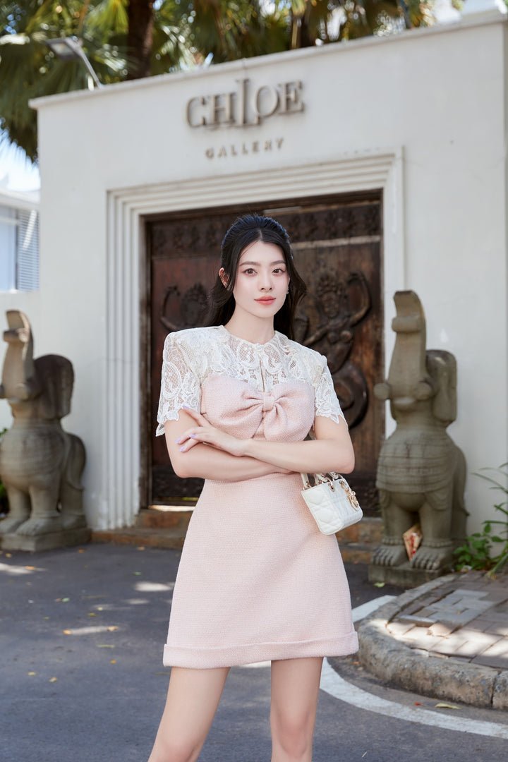 Đầm nổi bật với chi tiết nơ tạo điểm nhấn trước ngực tạo nét mới lạ cho sản phẩm. Sự kết hợp khéo léo giữa chất liệu tweed và ren khiến chiếc váy càng thêm duyên dáng và nữ tính.