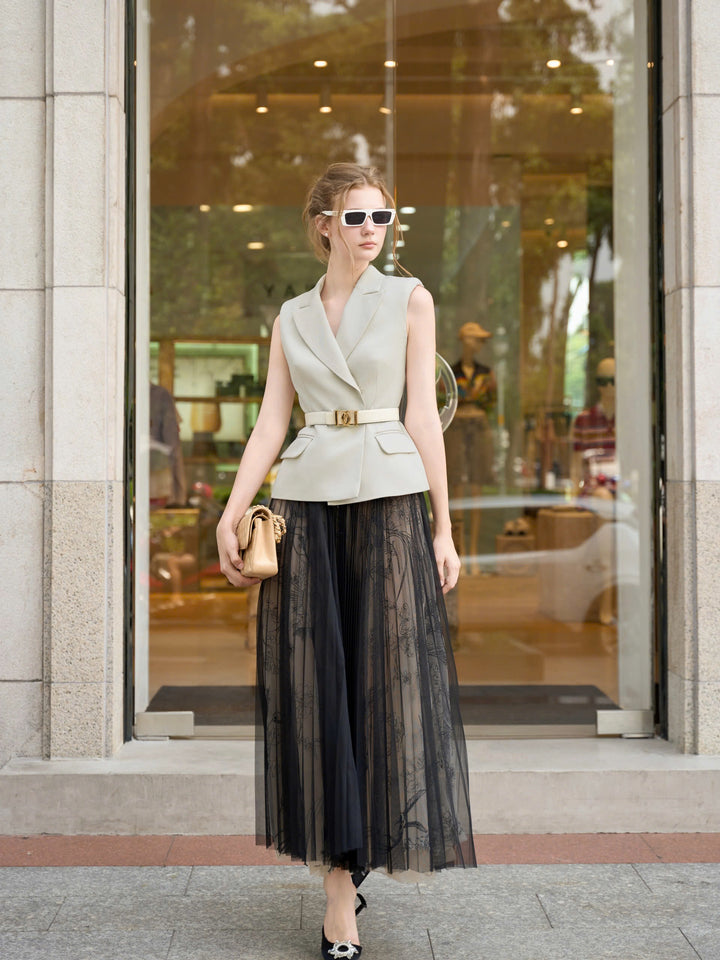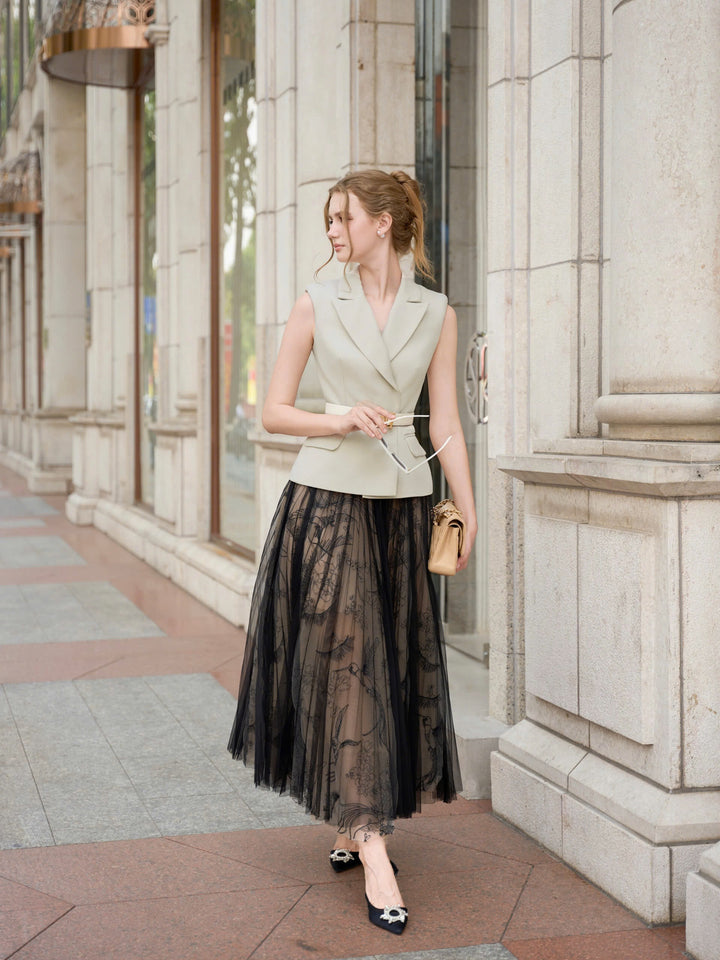 Thiết kế giữ nguyên phom dáng cổ vest thanh thoát, khi kết hợp cùng Quinn Skirt dáng dài dập ly, tạo nên điểm nhấn từ chất liệu xuyên thấu cao cấp và họa tiết thêu chìm nhẹ nhàng.