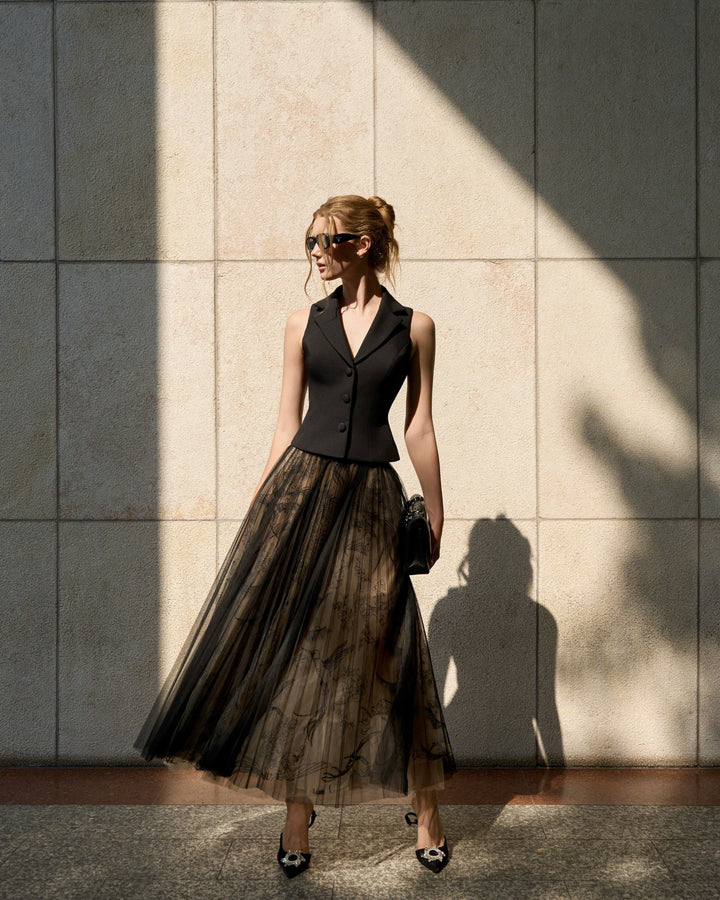 Phần áo vest không tay tôn dáng mạnh mẽ kết hợp cùng chân váy dáng dài xếp ly nhẹ nhàng, tạo nên sự cân bằng hoàn hảo giữa nữ tính và khí chất công sở hiện đại.
