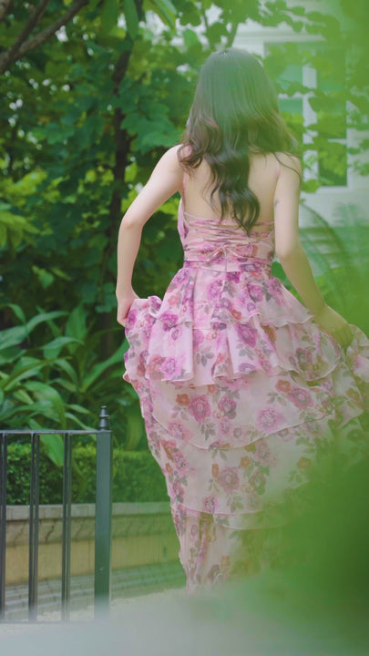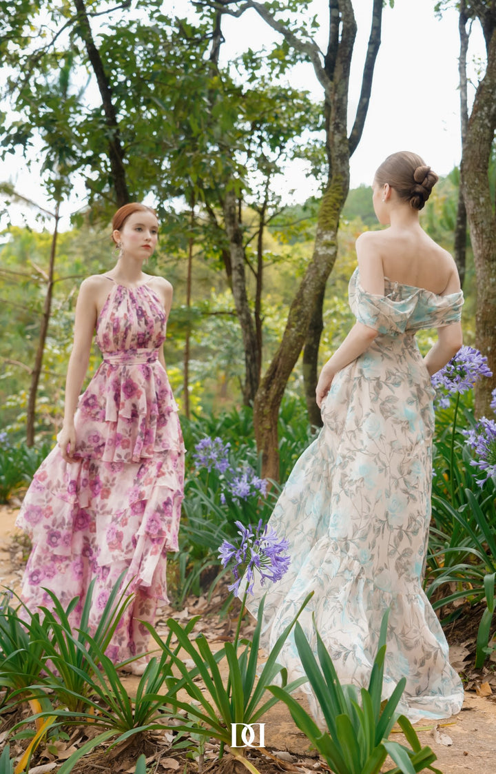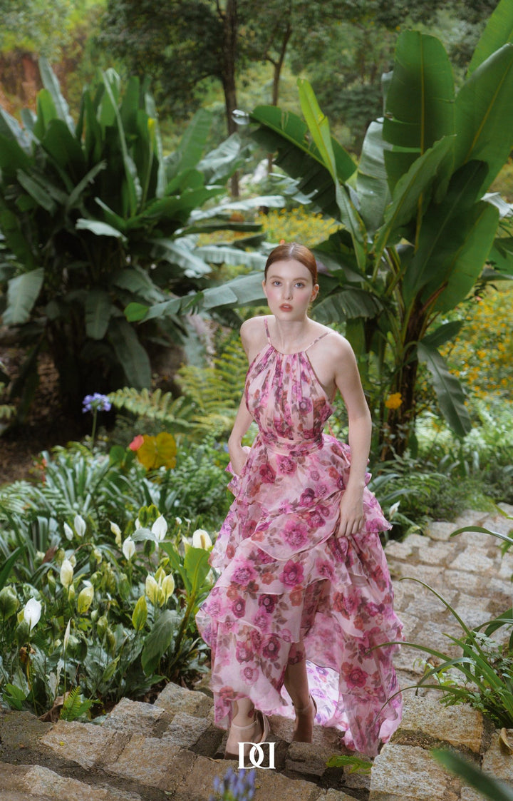 With delicate printed floral patterns, the dress brings an image of a flower garden that created a gentle and feminity look. A halter neck design cleverly showed off her slender shoulder that further enhanced the feminity of the wearer.