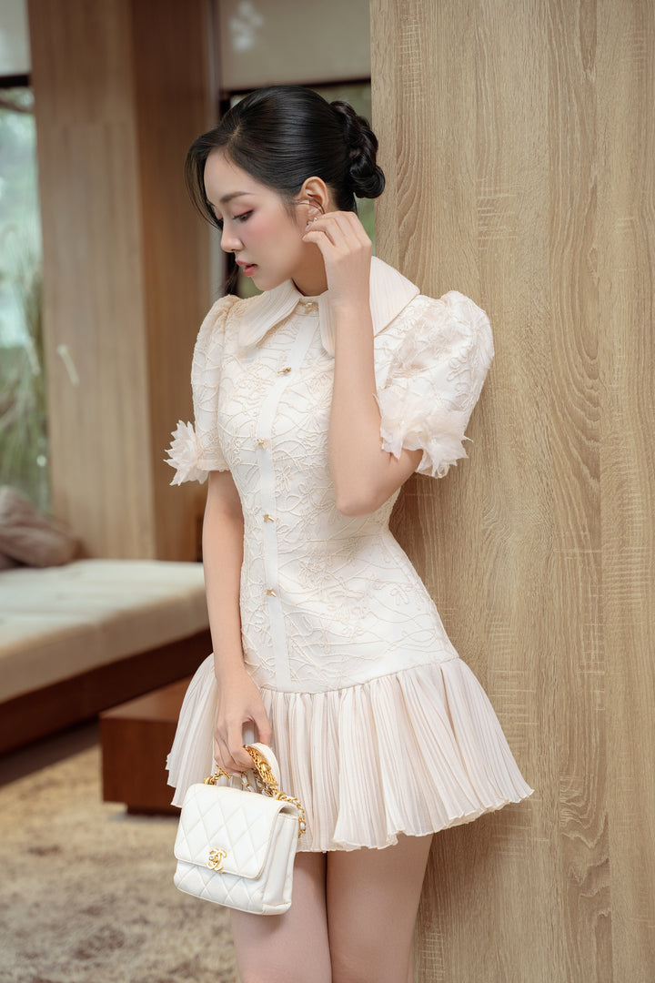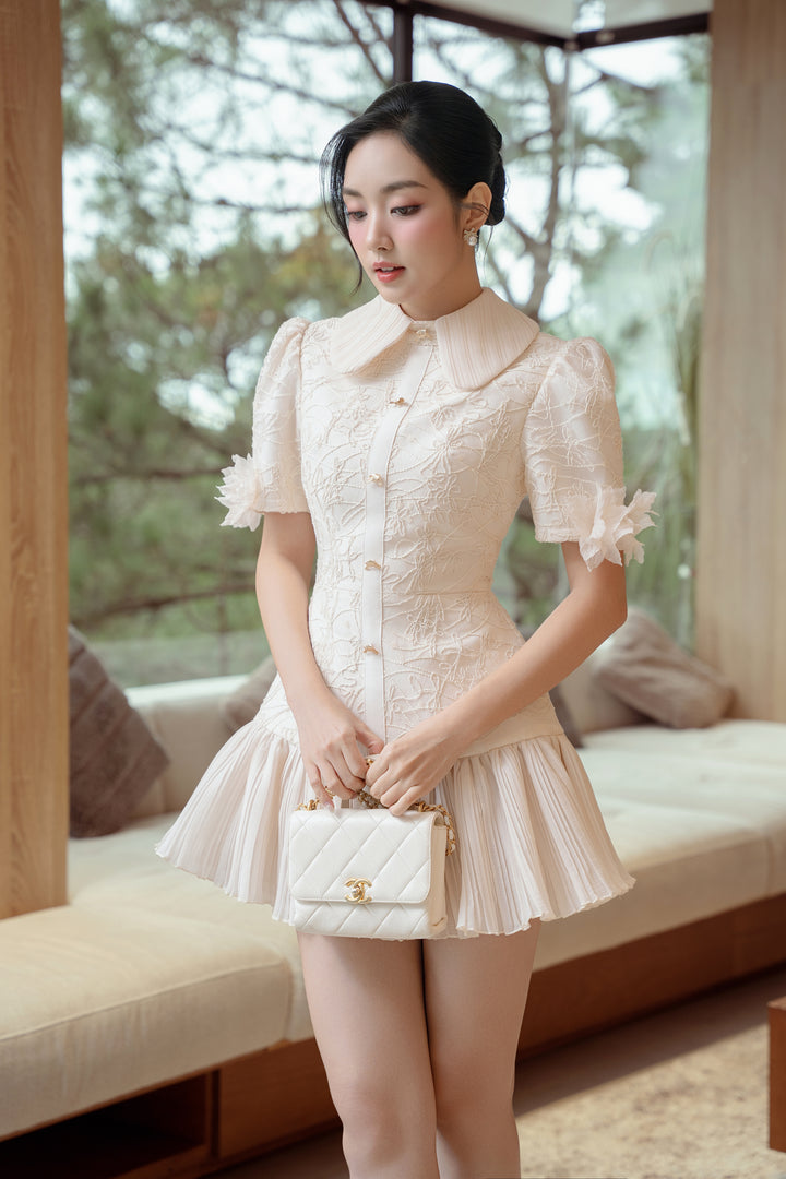 Chất liệu ren cao cấp phủ hoa nổi mềm mại, ôm nhẹ đường cong tạo nên sự duyên dáng đầy nữ tính. Phần cổ bẻ to mang hơi thở vintage, kết hợp tay bồng điểm hoa 3D tinh xảo và chân váy xếp ly bồng bềnh – tất cả hòa quyện để khắc họa hình ảnh nàng tiểu thư yêu kiều, thanh tao mà vẫn đầy sức hút.