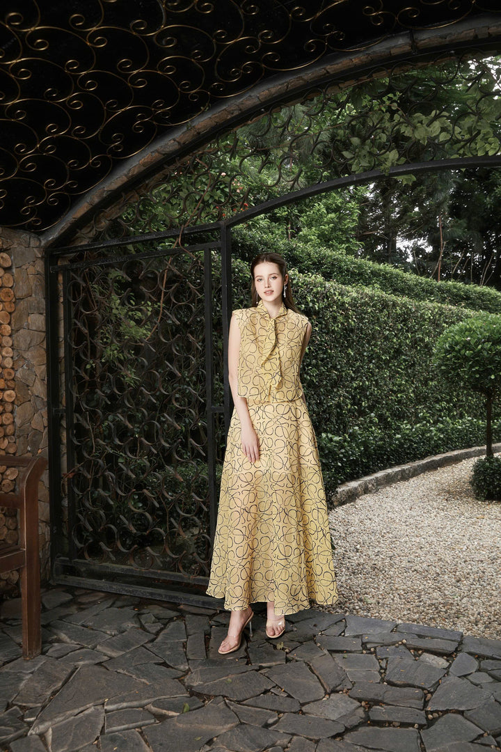 Gam vàng rực rỡ kết hợp họa tiết đường lượn uốn cong mang lại sự tươi mới và hiện đại. Thiết kế crop-top thắt nơ tạo sự duyên dáng phối cùng chân váy dài xoè nhẹ nhàng, vừa trẻ trung vừa giữ được sự tinh tế, hoàn hảo cho những buổi dạo chơi hoặc gặp gỡ mùa hè.