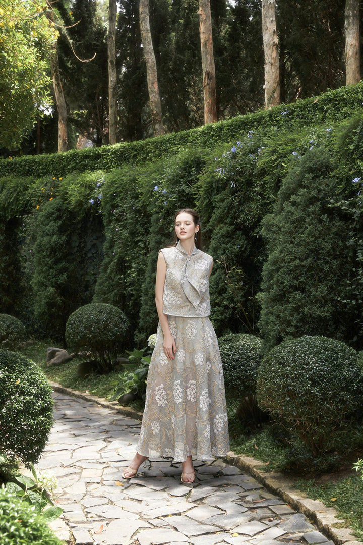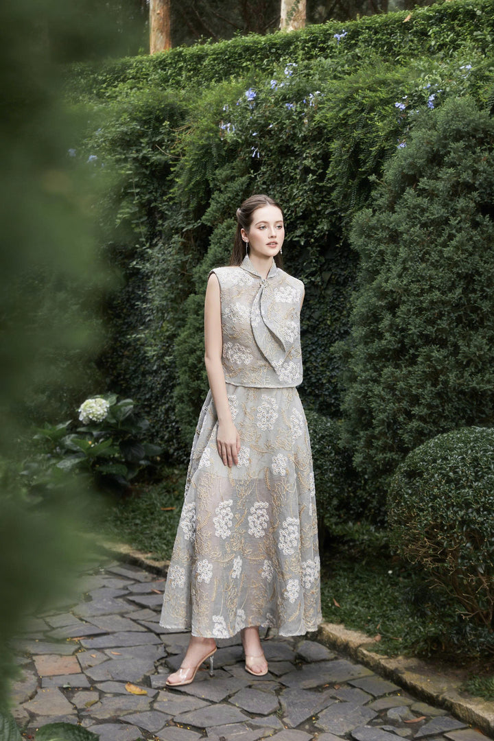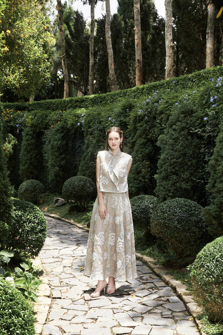 Áo cổ nơ không tay kết hợp chân váy dài, sử dụng chất liệu voan thêu ren nổi ánh kim xen kẽ họa tiết hoa trắng thanh khiết.