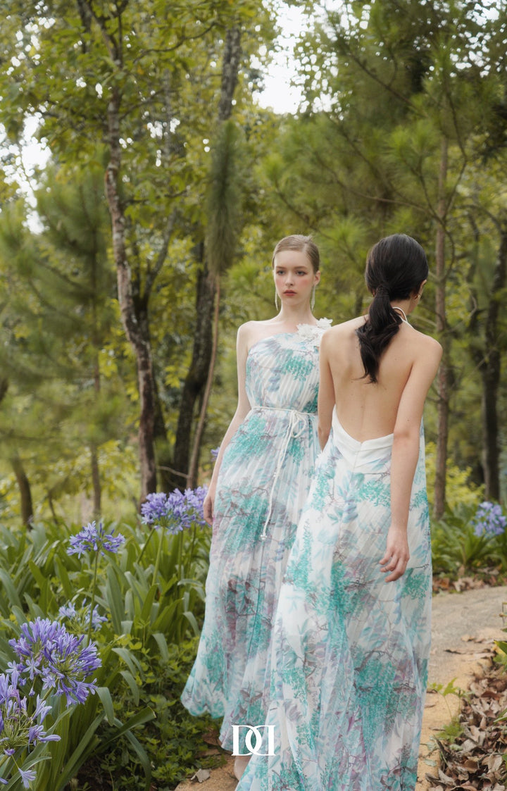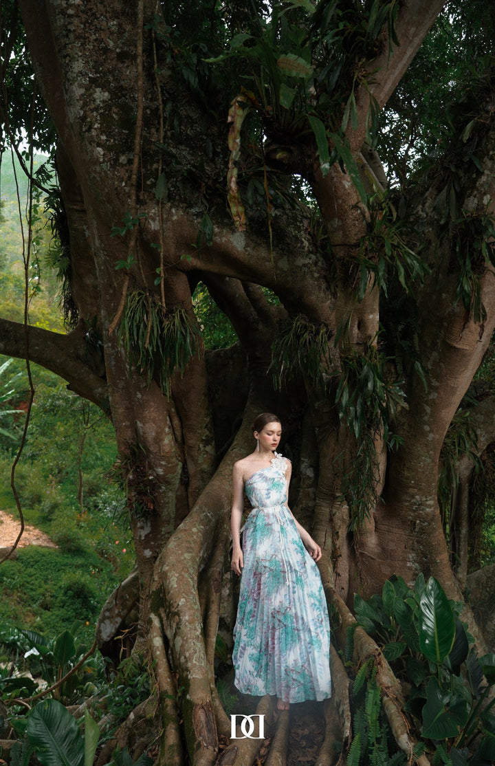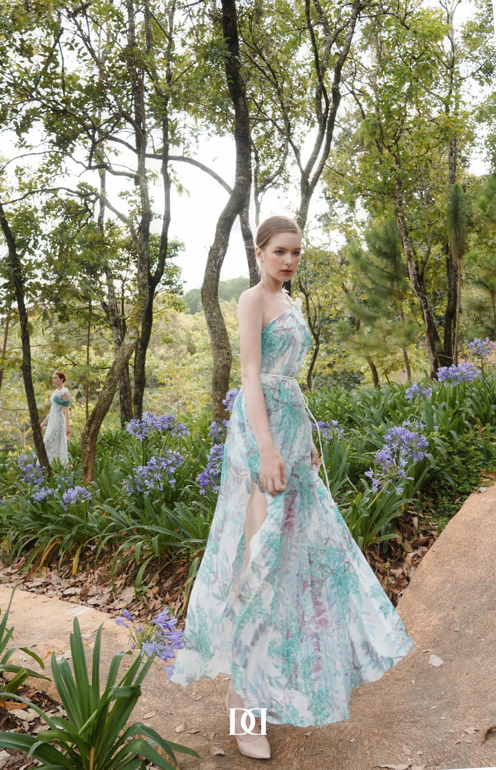 Soft like a winding stream, the dress with a tunic silhouette will give her a light and soaring experience. Floral lace patterns are also adorned delicately to accent her thin shoulder and elevated the costume's gentleness.