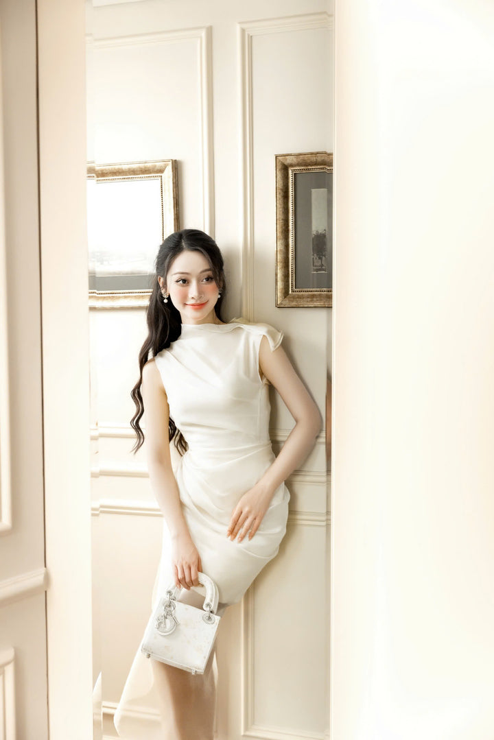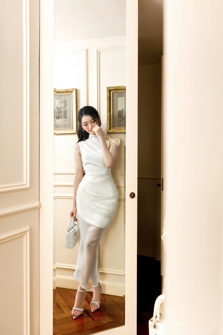 Thiết kế drapping mềm mại ôm trọn đường cong, tạo hiệu ứng chuyển động tinh khôi đầy mê hoặc. Chất liệu tơ xốp cao cấp, tỉ mỉ trong từng đường xếp nếp, mang đến sự thanh lịch mà vẫn đầy quyền lực.