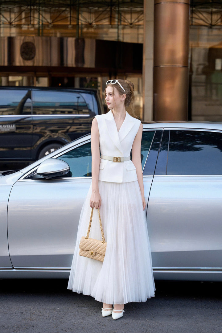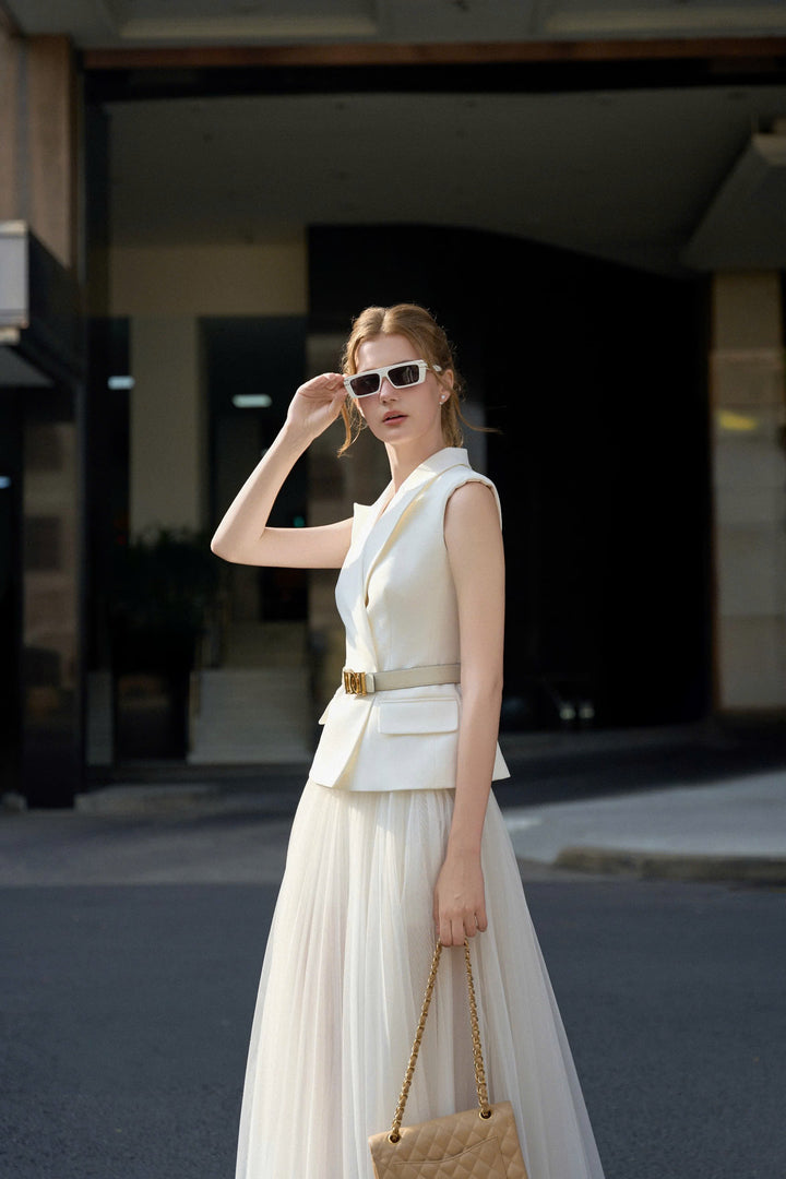 Chiếc áo cổ vest thanh lịch hiện đại mang đến vẻ ngoài chỉn chu, nhẹ nhàng nhưng vẫn rất thời thượng. Phối cùng Darla Skirt dáng dài dập ly như giúp tổng thể outfit trở nên hài hòa và cuốn hút. Nhấn nhá thêm chiếc belt tạo điểm nhấn vừa đủ khiến set trang phục trở nên hoàn hảo cho những buổi dạo phố hay café cuối tuần.