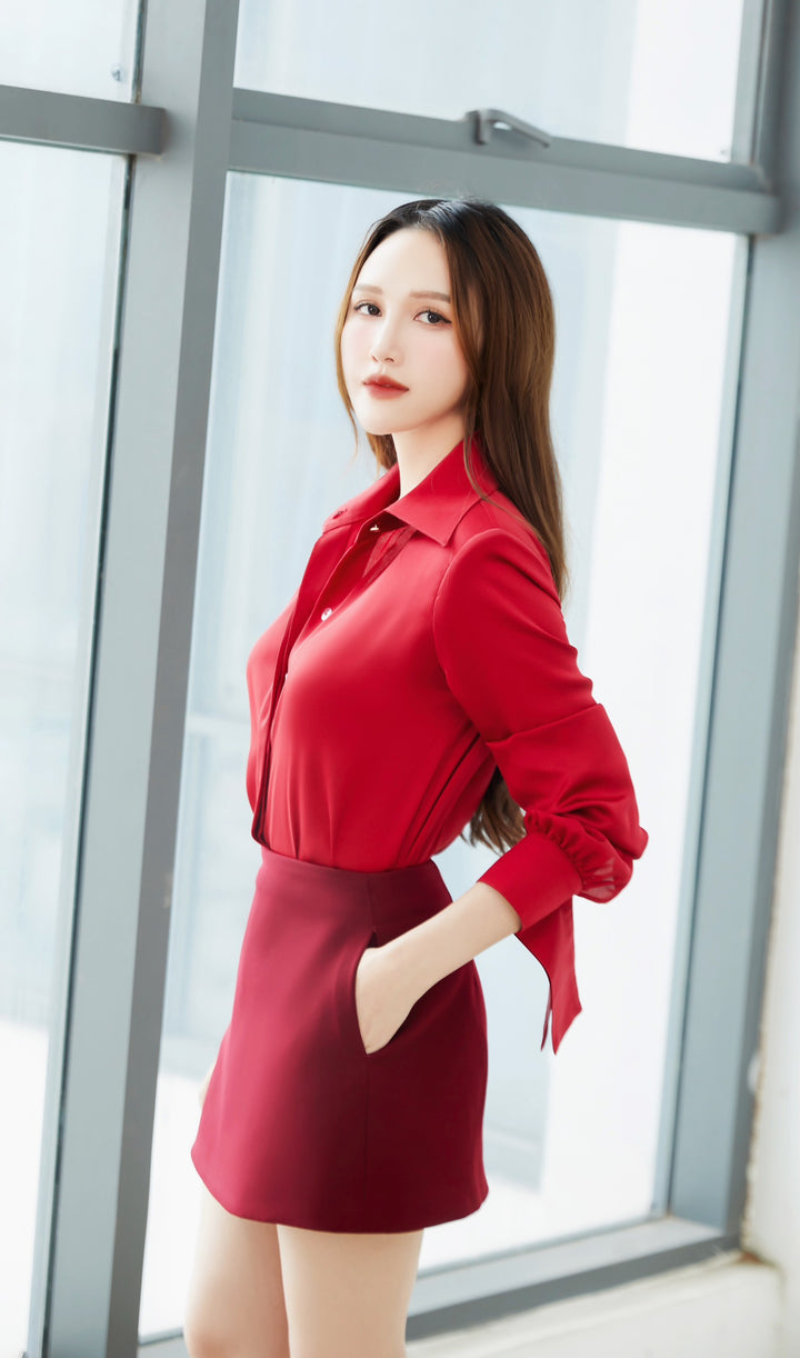 Irene Top (Red) - Áo Lụa Độn Vai Tay Dài Cổ Sơmi