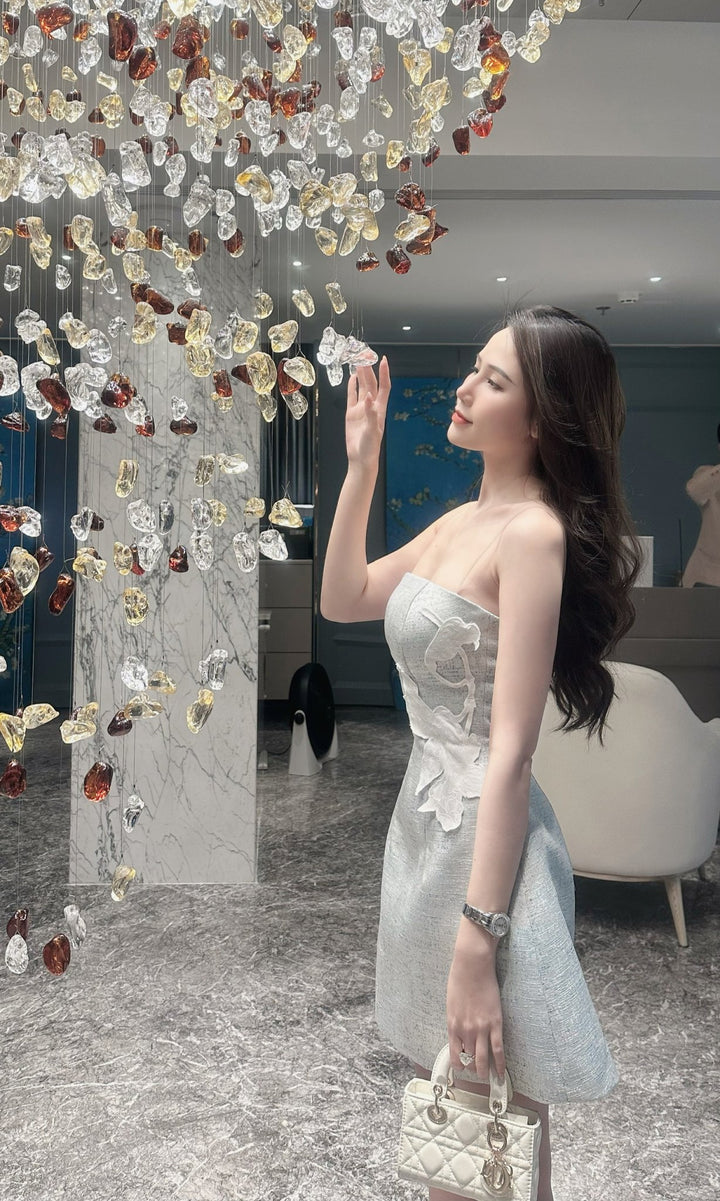 Kiwin Dress - Đầm cúp ngực thêu hoa dáng chữ A thường có vẻ ngoại hình quyến rũ, tinh tế và rất nữ tính. Đầm này phù hợp cho các buổi tiệc, dạ tiệc, lễ cưới hoặc các sự kiện trang trọng khác. Phối đồ cùng phụ kiện như clutch bag, giày cao gót hay sandal cùng trang sức nhẹ nhàng sẽ tôn lên vẻ đẹp sang trọng và quyến rũ của bộ trang phục này.
