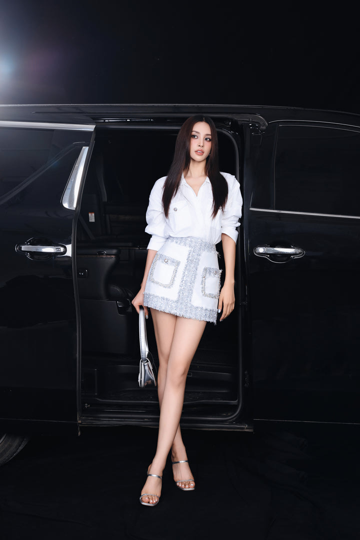 Layla Set - Áo Sơmi Cổ V Tay Phồng Đính Túi & Chân Váy Tweed Phối Dáng Chữ A