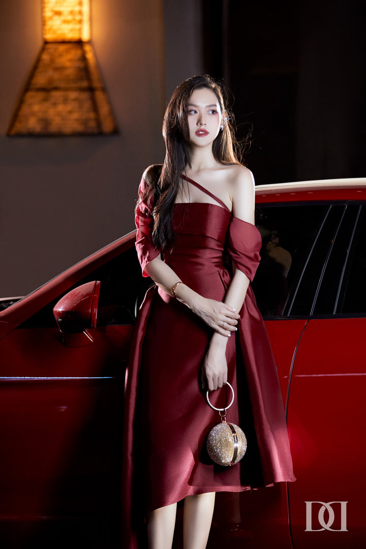 Litso Dress - Đầm Midi Taffta Xếp Ly Ngực Dây Chéo Dáng Xòe