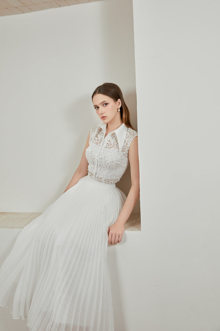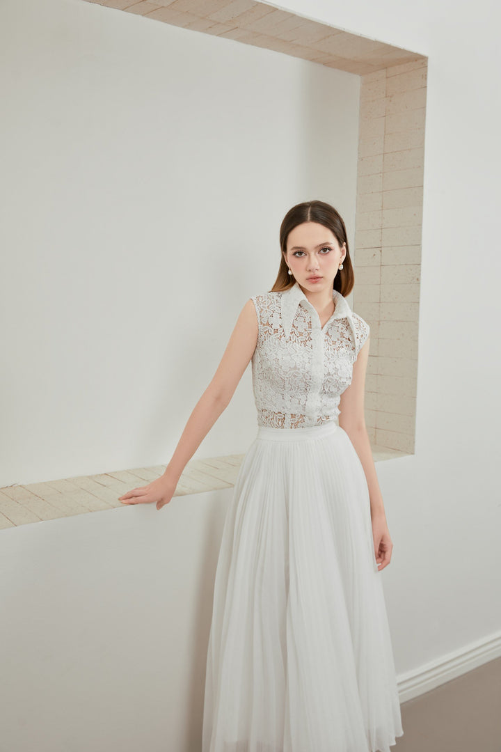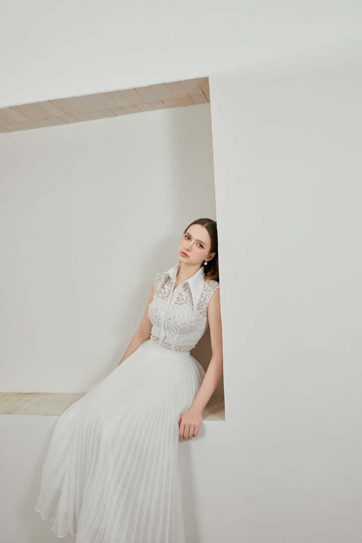 Lotis Set - Áo sơ mi ren cổ chữ V và chân váy midi dập ly