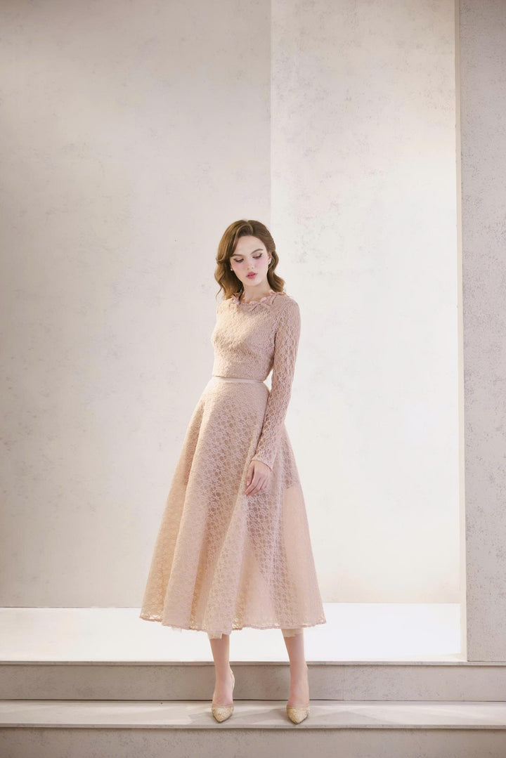 Thiết kế váy ren hồng pastel mang đến vẻ đẹp thanh lịch và nhẹ nhàng, với phần cổ áo sơ mi tinh tế cùng tay dài ôm gọn tạo nên phong thái kín đáo nhưng vẫn đầy cuốn hút.