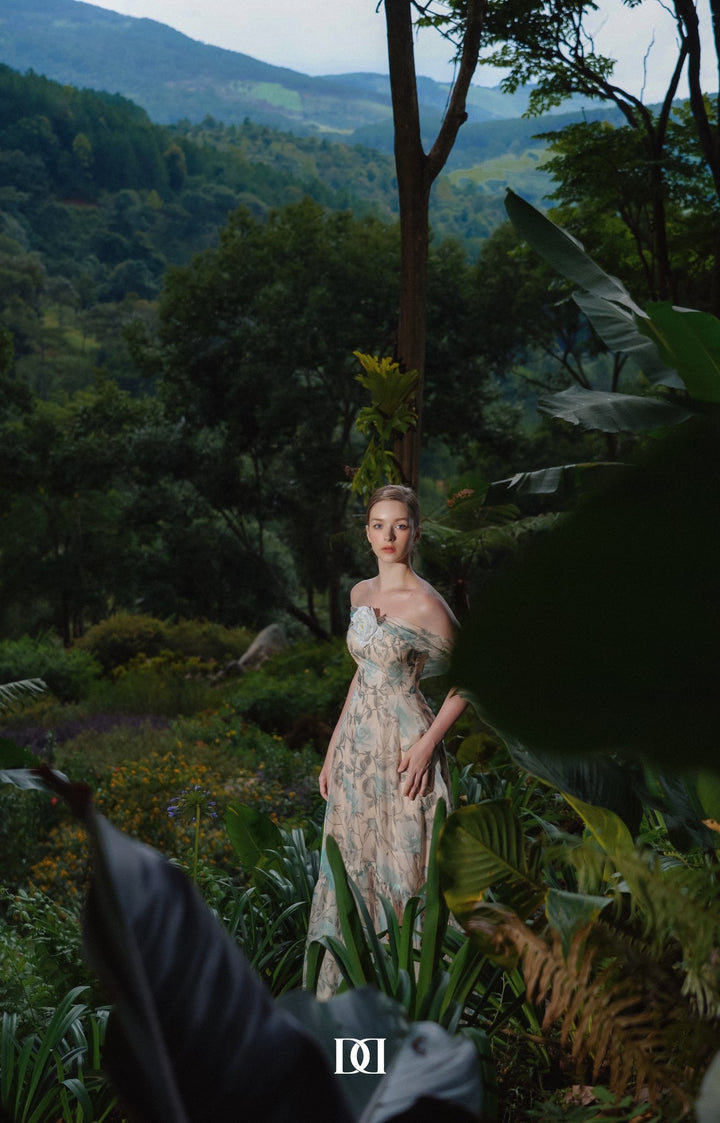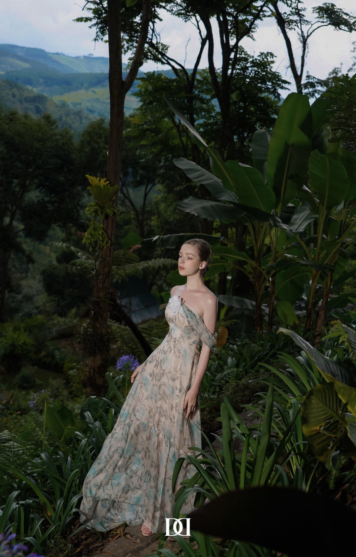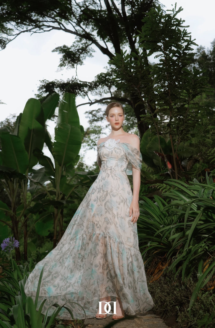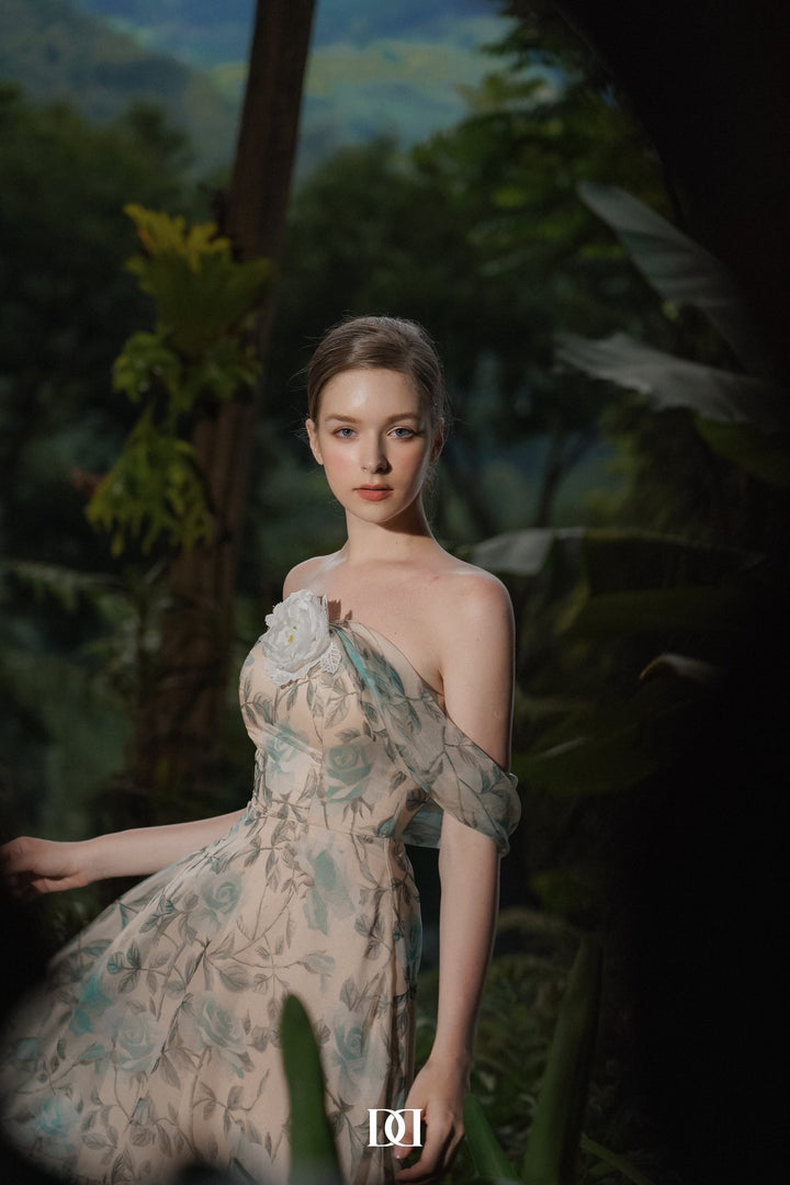With arm-covered flaps and a flared skirt design, the dress brings a gentle and willowy look to the wearer and turns her into a lovely princess. Delicate printed patterns with light tones also increase the feminity of the costume.
