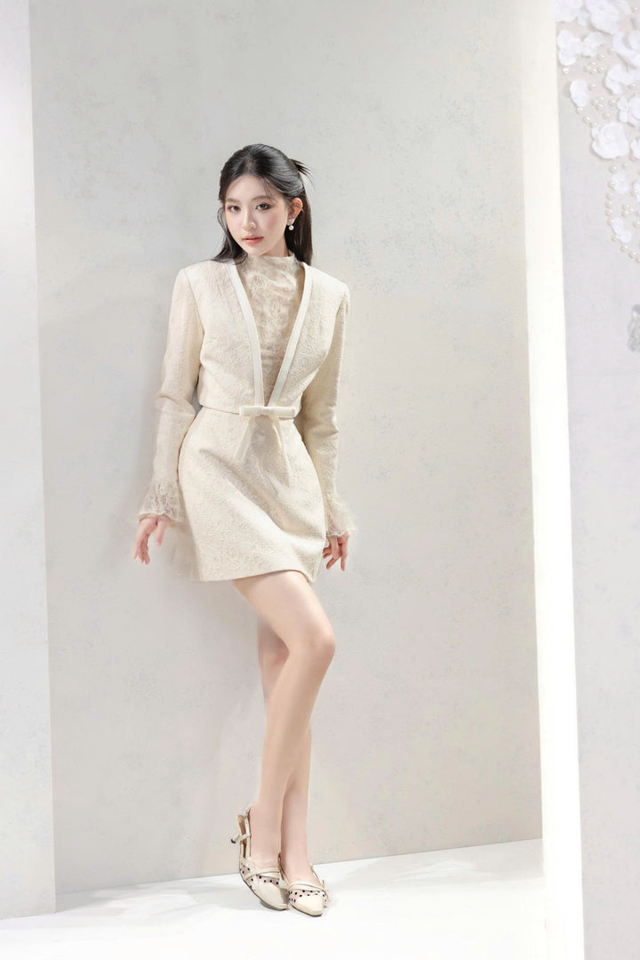 NORIN SET - Set Đầm Tweed Phối Áo Ren Trắng Dài Tay Điểm Xuyến Nơ Cổ Điển