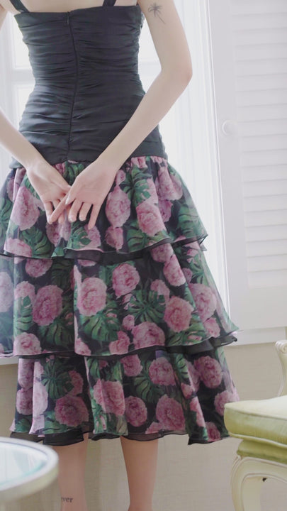 The harmonious combination of tones creates the feeling of a mesmerizing flower forest but is still extremely feminine. A fitted form with gathered seams enhanced her physique while the layered skirt bring a willowy look to the costume.