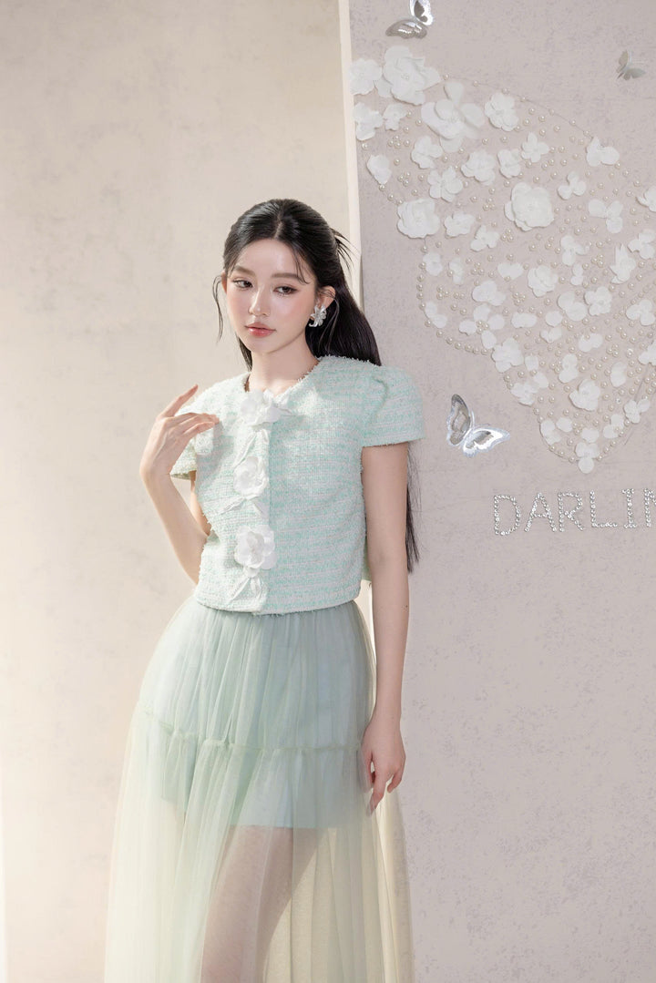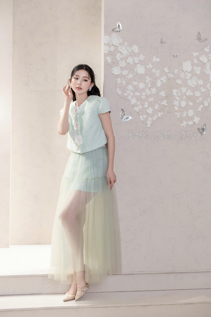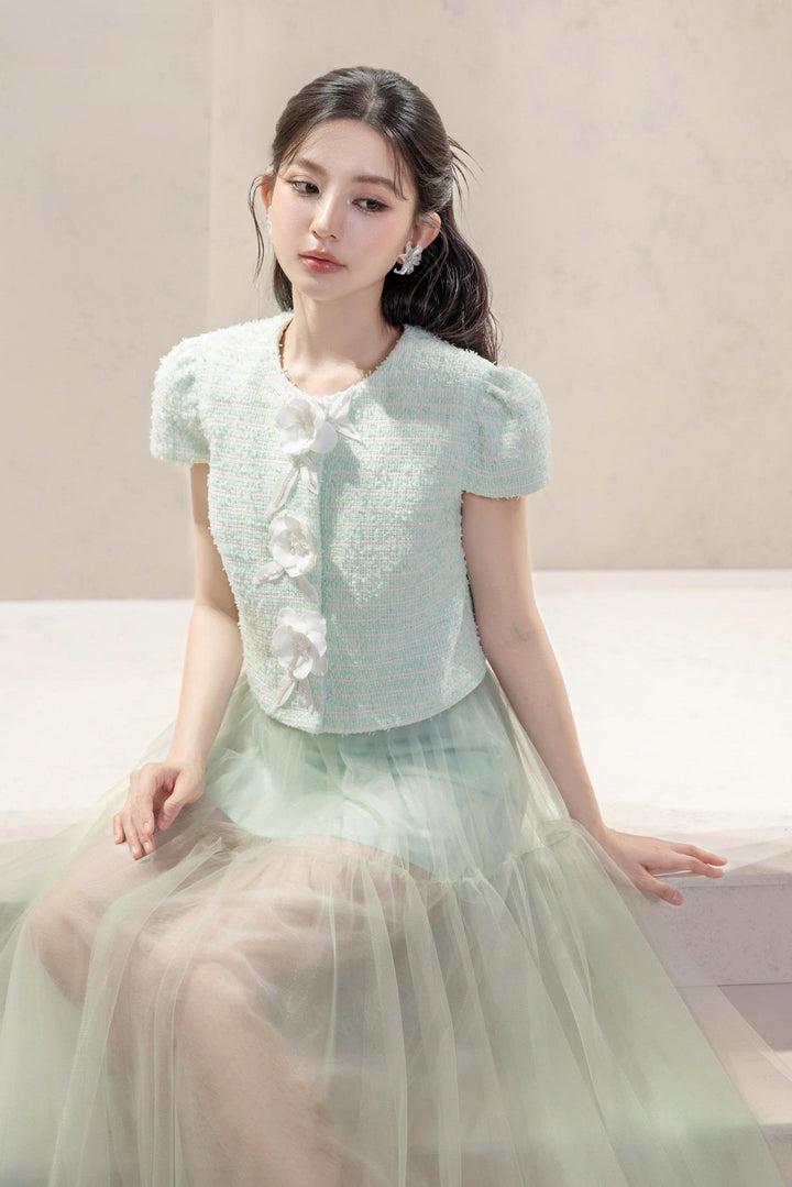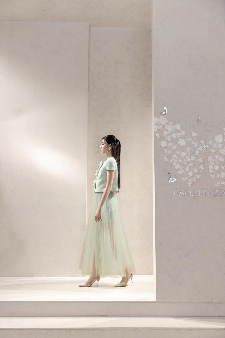 Một thiết kế đầy chất thơ với sự kết hợp giữa áo tweed xanh ngọc đính hoa nổi và chân váy voan mỏng nhẹ.