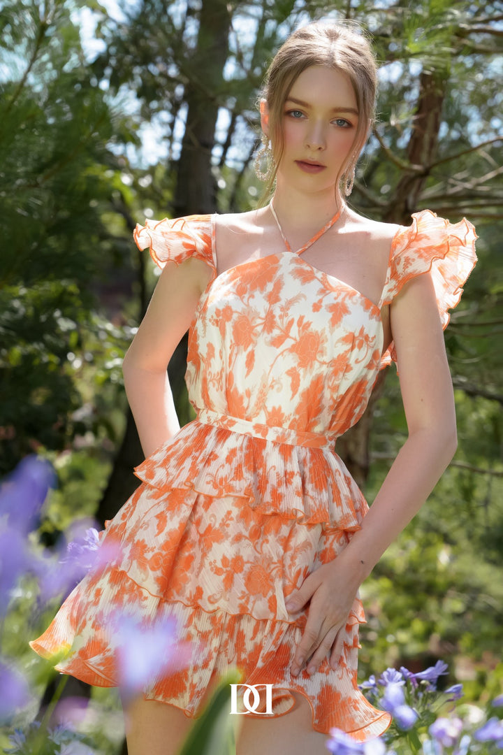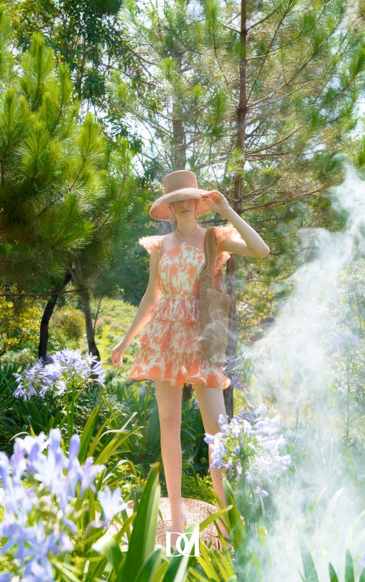 Trên nền vải voan mỏng nhẹ với tông màu cam dịu nhẹ, chiếc váy đã khéo léo vẽ nên một bức tranh sống động và ảo diệu. Kiểu trễ vai cùng chân váy xếp tầng tạo nét phóng khoáng tôn lên vẻ trẻ trung, cá tính của cô.