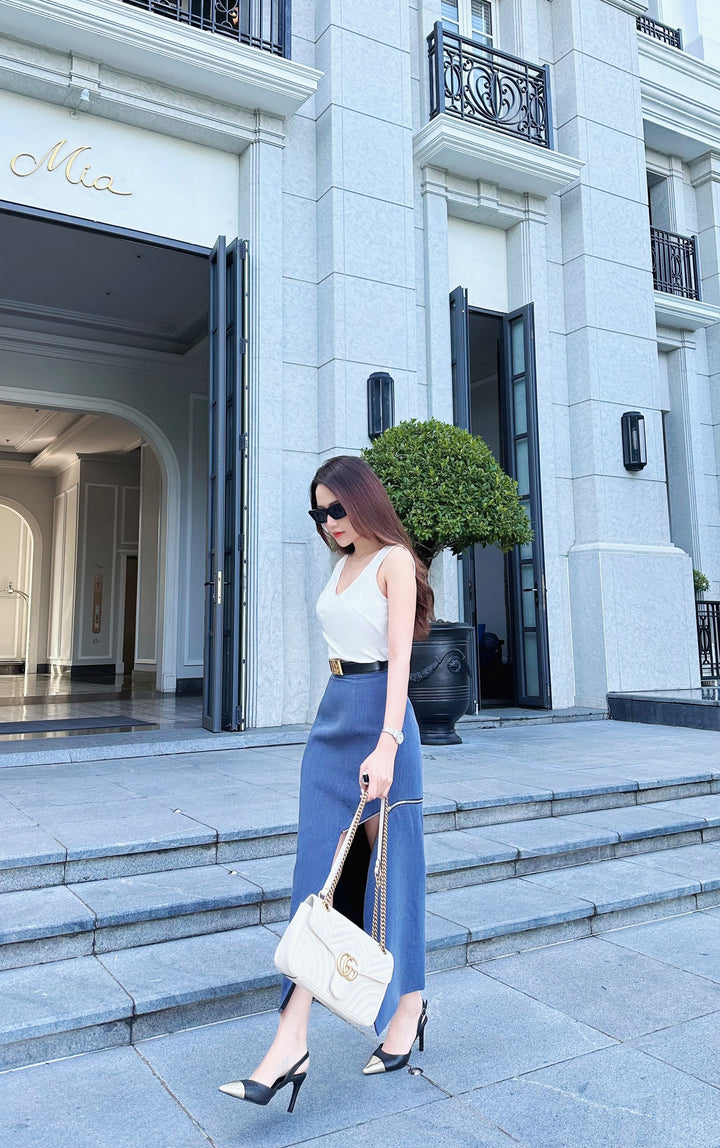 Sina Top & Baylis Skirt - Áo thun Cổ Tròn Hai Dây Và Chân Váy Bút Chì Xẻ Cách Điệu Khóa Kéo tạo điểm nhấn độc đáo, tăng thêm sự mới lạ và sáng tạo cho bộ trang phục. Sự kết hợp này có thể phản ánh phong cách cá nhân và sự sáng tạo trong cách mix-match trang phục hàng ngày, phù hợp cho những người muốn thể hiện sự tự tin và phong cách riêng biệt.
