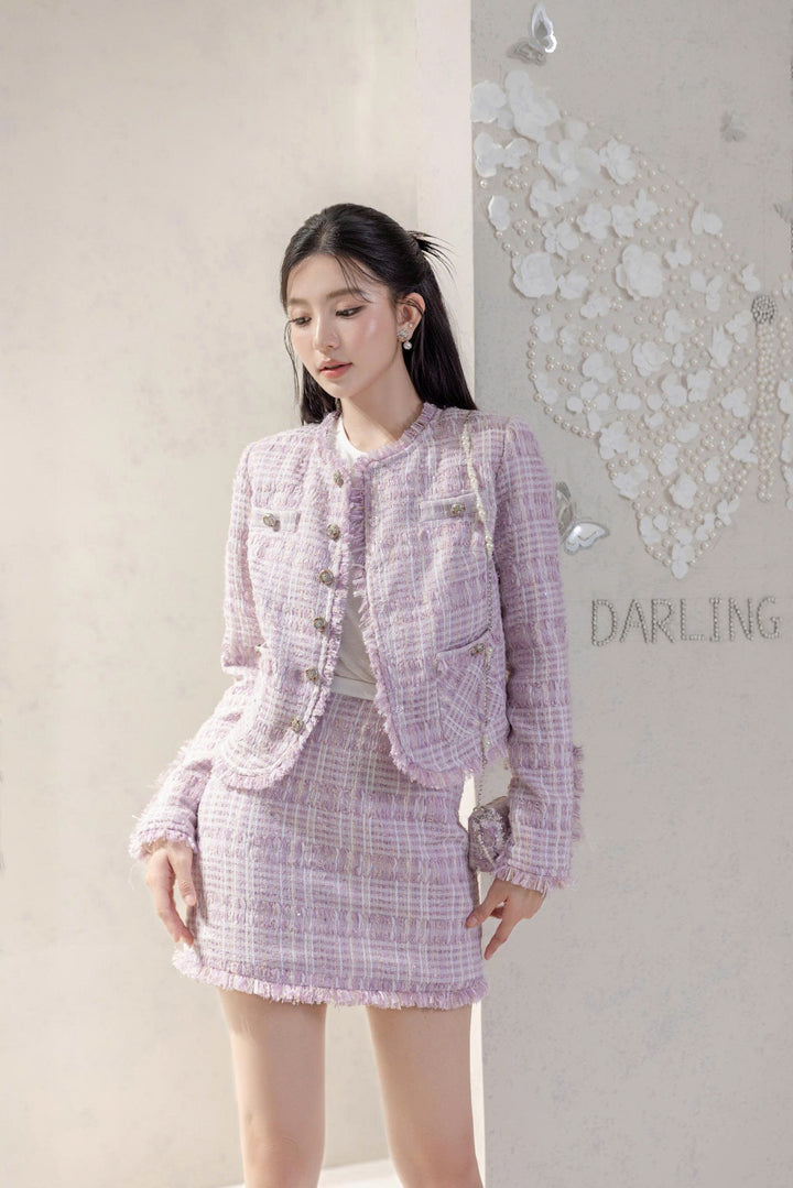Bộ tweed tím mang phong thái tiểu thư hiện đại với chi tiết cúc ánh kim tinh xảo cùng phom dáng ôm vừa vặn, giúp tôn lên nét thanh lịch và ngọt ngào.