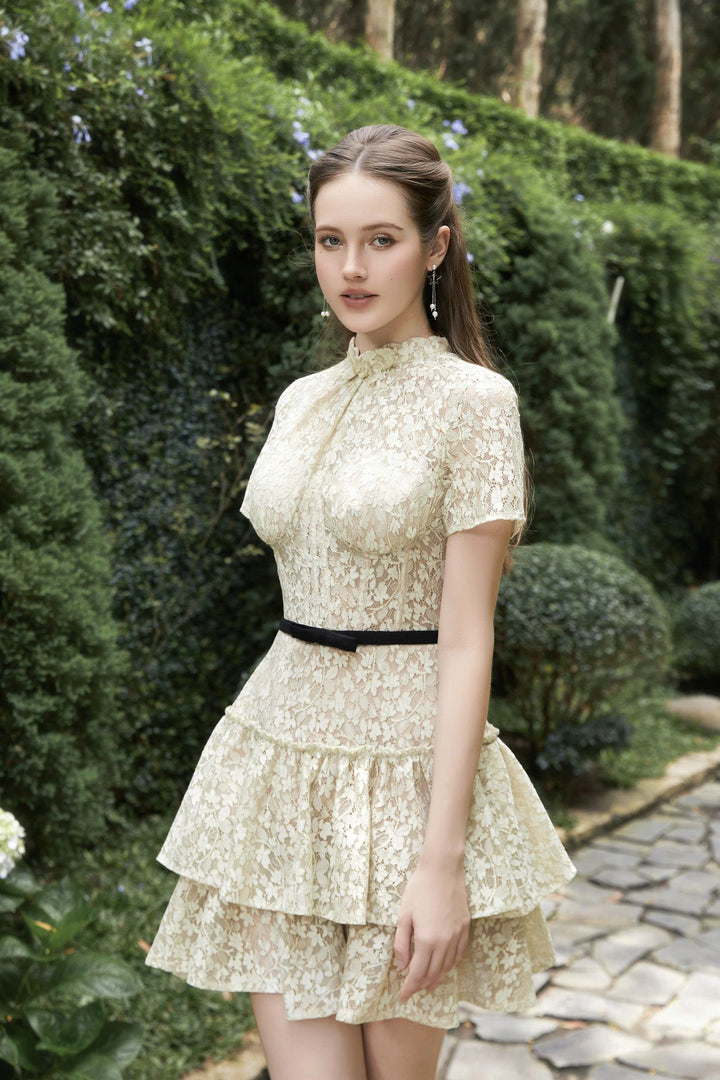 Đầm ren sắc xanh lá pastel ngắn với hoạ tiết ren hoa tinh xảo, cổ cao thanh lịch và phần eo nhấn bằng đai đen mảnh mai tạo điểm nhấn tương phản duyên dáng.
