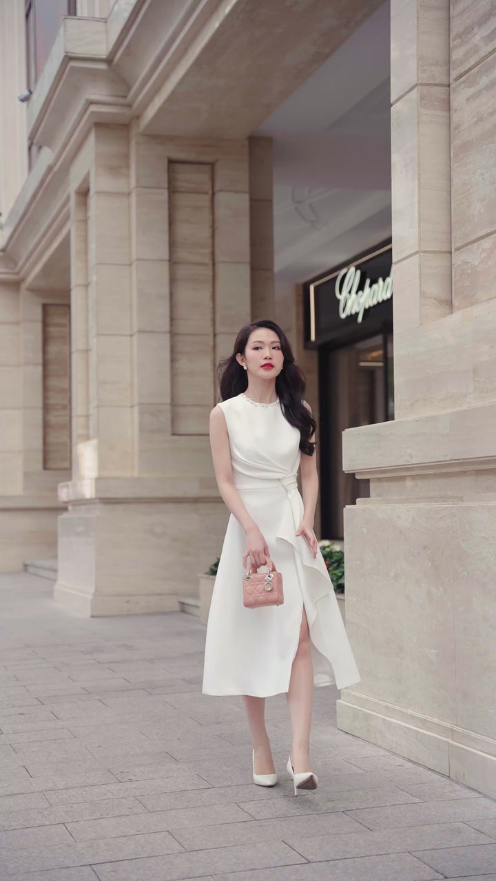 Bộ váy chứng tỏ sức hút của mình khi biến hóa ấn tượng trên tông màu trắng trơn cổ điển với điểm nhấn là phần vạt xoắn ở eo tạo hiệu ứng uốn lượn bắt mắt, chắc chắn sẽ thu hút mọi ánh nhìn ngay từ cái nhìn đầu tiên.
