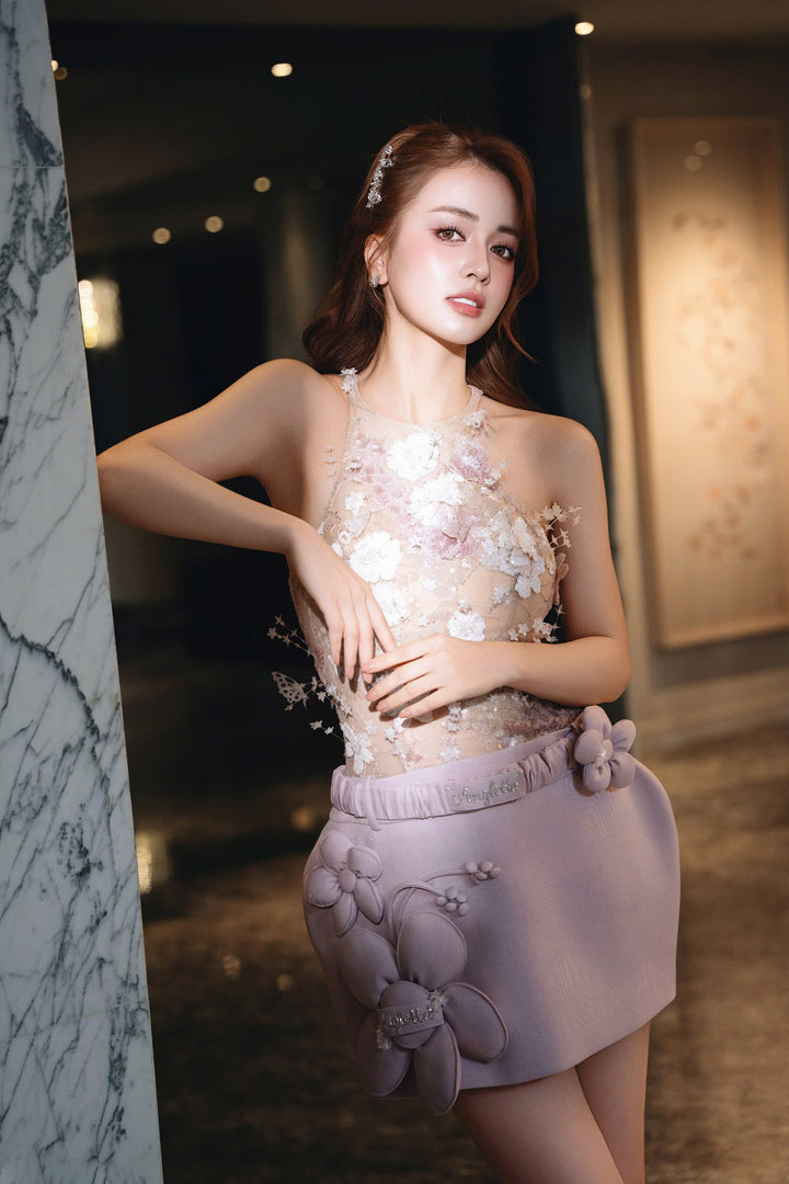Phần thân trên là dáng cổ yếm gợi cảm với lớp ren xuyên thấu đính kết hoa 3D tỉ mỉ, tạo nên một bức tranh hoa cỏ mộng mơ. Trong khi đó, chân váy được xử lý tinh xảo từ chất liệu bố ruby cao cấp, tạo độ đứng phồng nhẹ nhàng cùng chi tiết hoa phồng độc đáo và sáng tạo