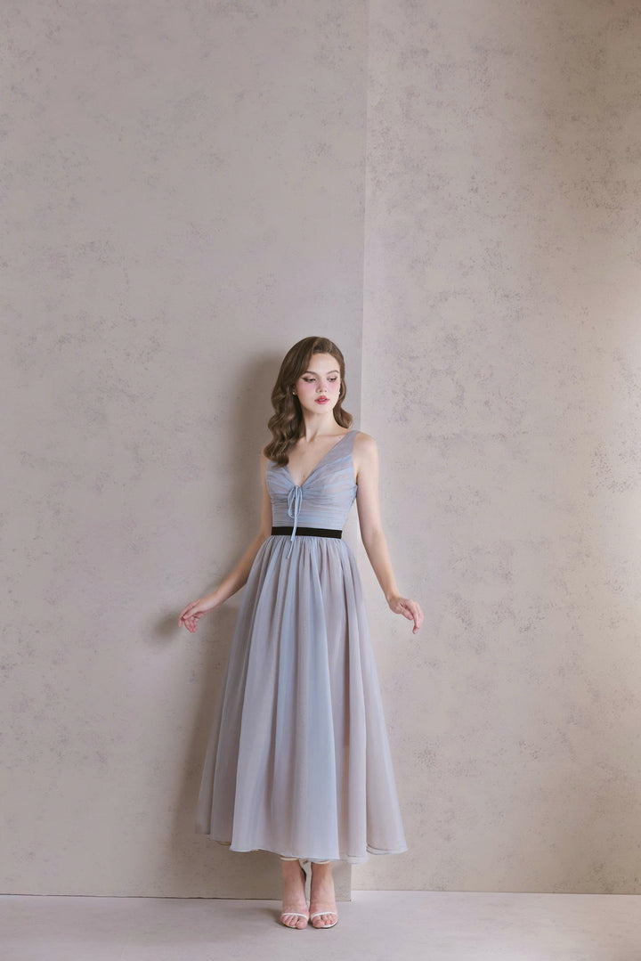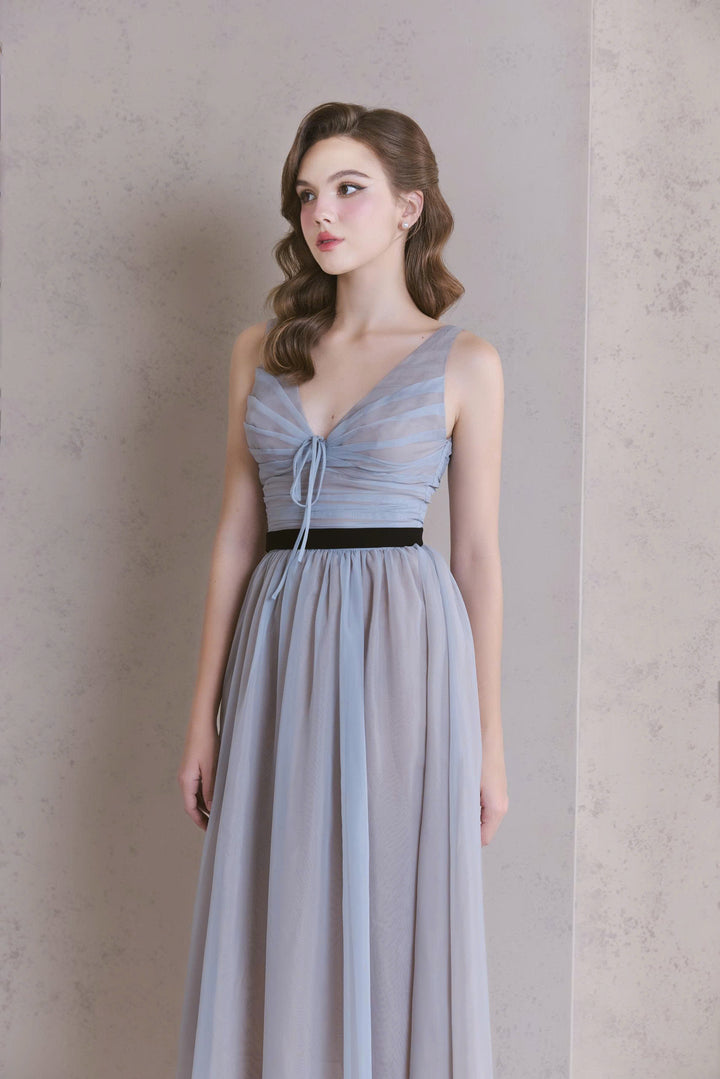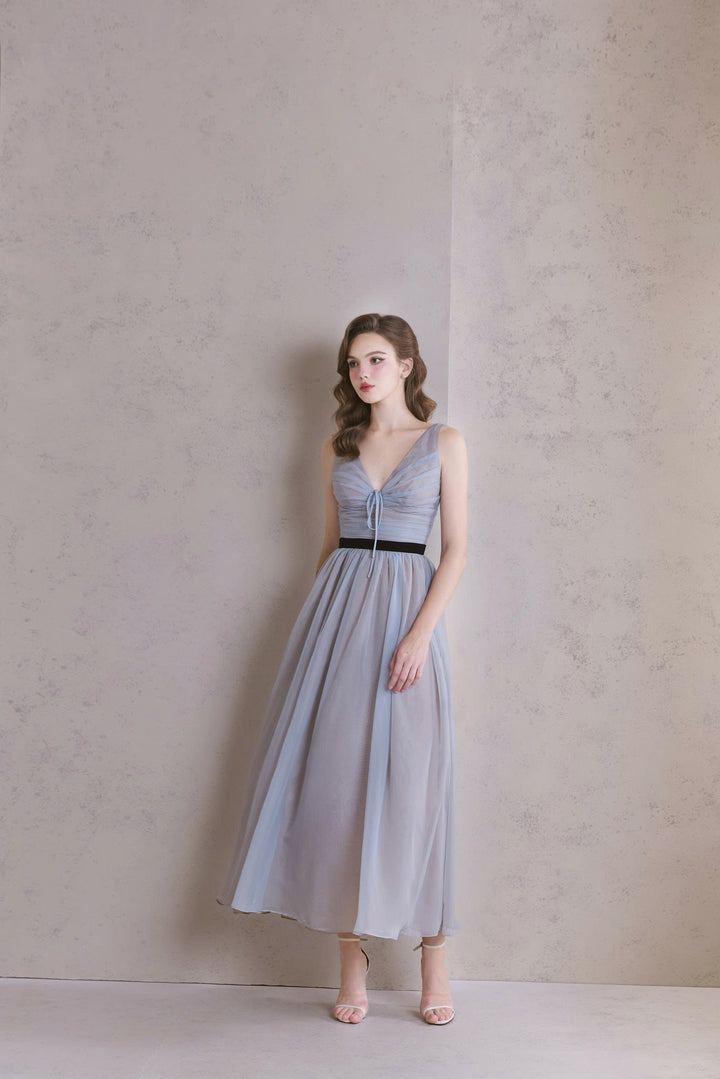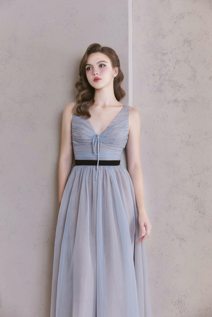 Chiếc đầm voan xám xanh nhạt với chi tiết dây rút trước ngực tạo nên điểm nhấn tinh tế, gợi cảm vừa đủ nhưng vẫn giữ được sự thanh tao.